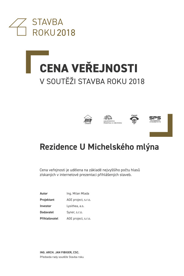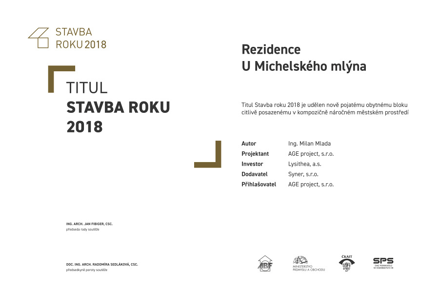 Titulem Stavba roku 2018 a Cenou veřejnosti se může chlubit pražská Rezidence U Michelského mlýna, jejímž zhotovitelem je stavební společnost SYNER.