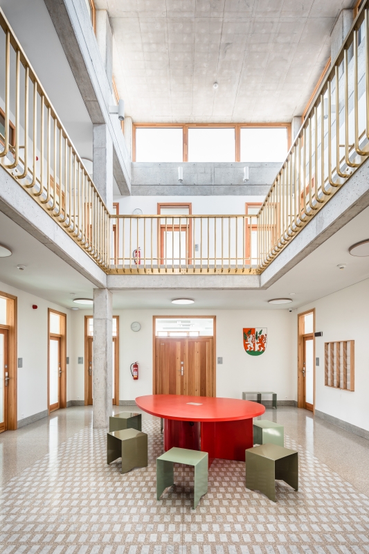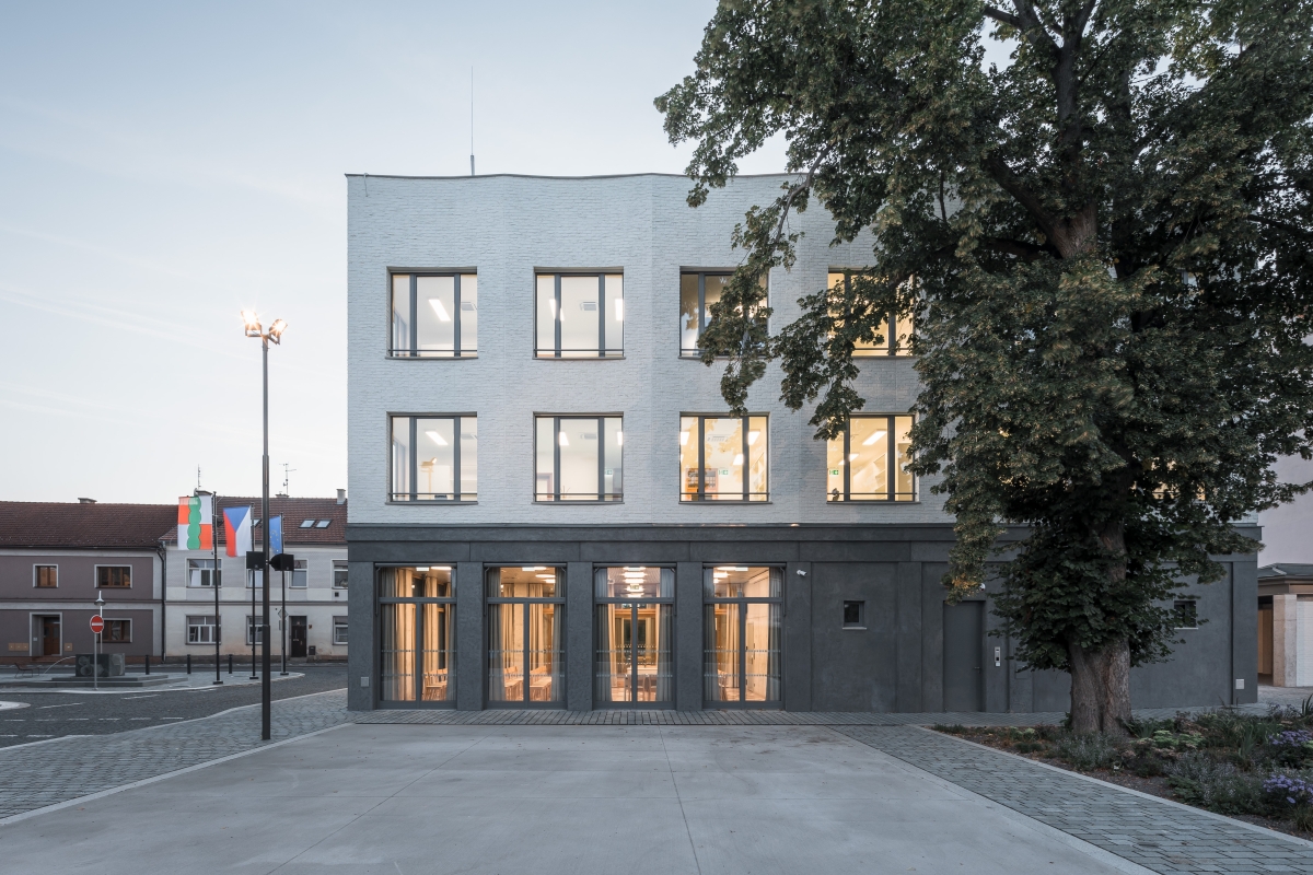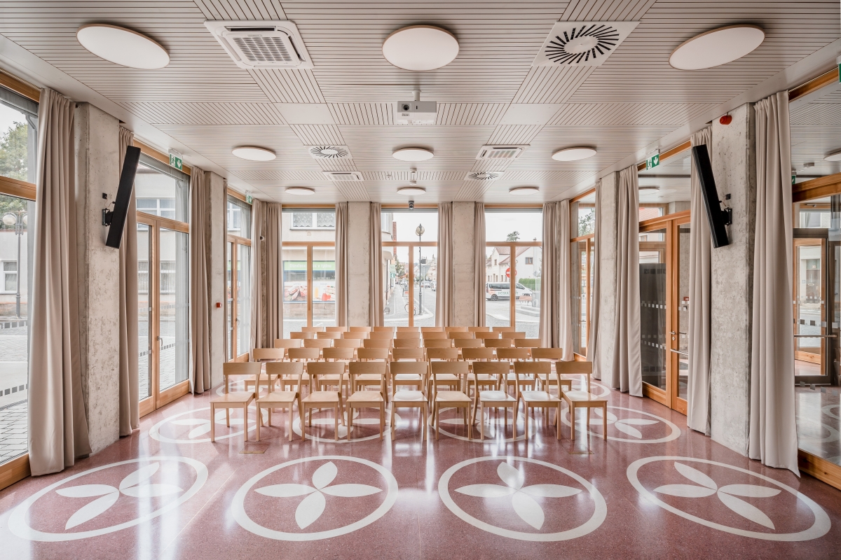 Zvolené schéma je přehledné, neodděluje jednotlivá pracoviště od sebe a podporuje dojem společné práce. Zároveň nabízí patřičné prostory pro občany, kteří čekají a připravují se na jednání v prostoru atria. Prostory přízemí je možné podle potřeb různých akcí variabilně propojovat, včetně možnosti otevřít sál ven do plácku u potoka, anebo přízemí používat nezávisle na provozu úřadu nad ním. A když zasedá zastupitelstvo ve velkém sále, tak je vidět z celého náměstí!