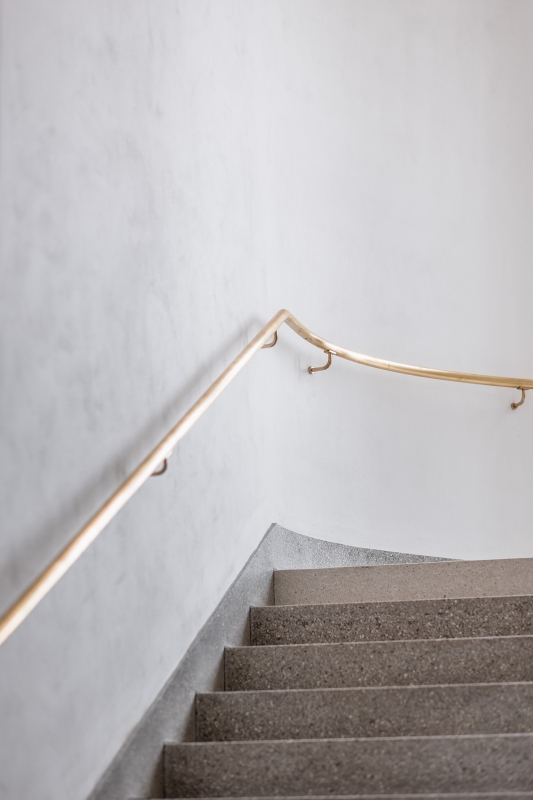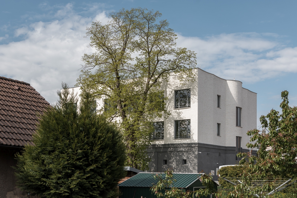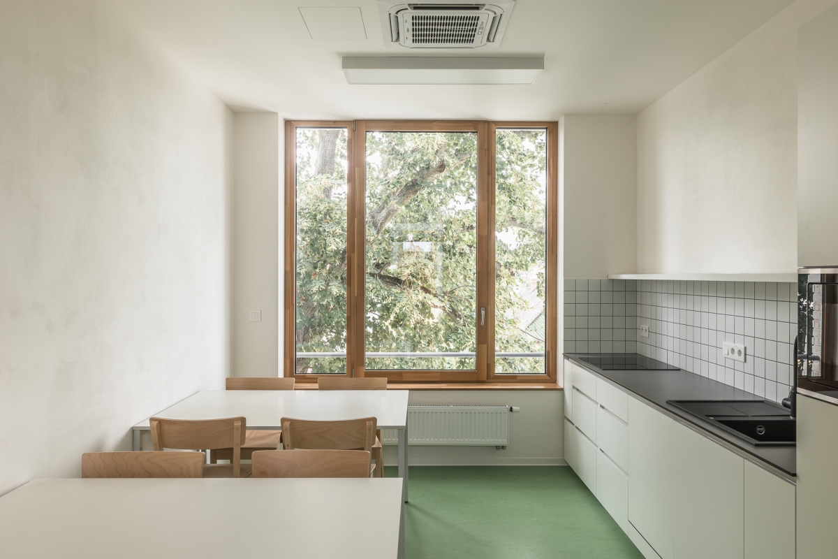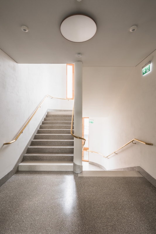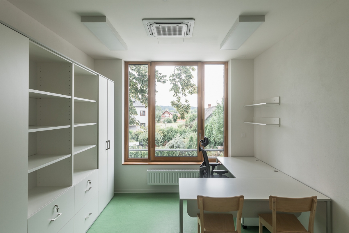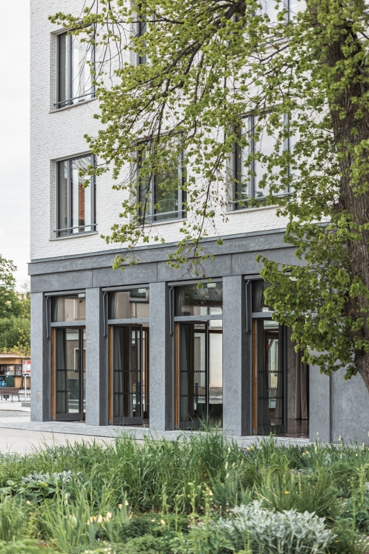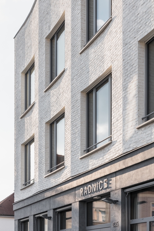 Sokl objektu je opatřen stěrkovou hladkou omítkou ve vzhledu betonu. Fasáda 2. NP a 3. NP je obložena řezanými cihelnými pásky natřenými na bílo. Spárořez pásků je navržen v souladu s lomy fasády a okenními otvory. Uvnitř budovy pracujeme s pohledovými betony a hladkými bílými omítkami. Podlahy jsou ve sdílených prostorech z teraca s podlahovým vytápěním, v kancelářích je navrženo marmoleum.