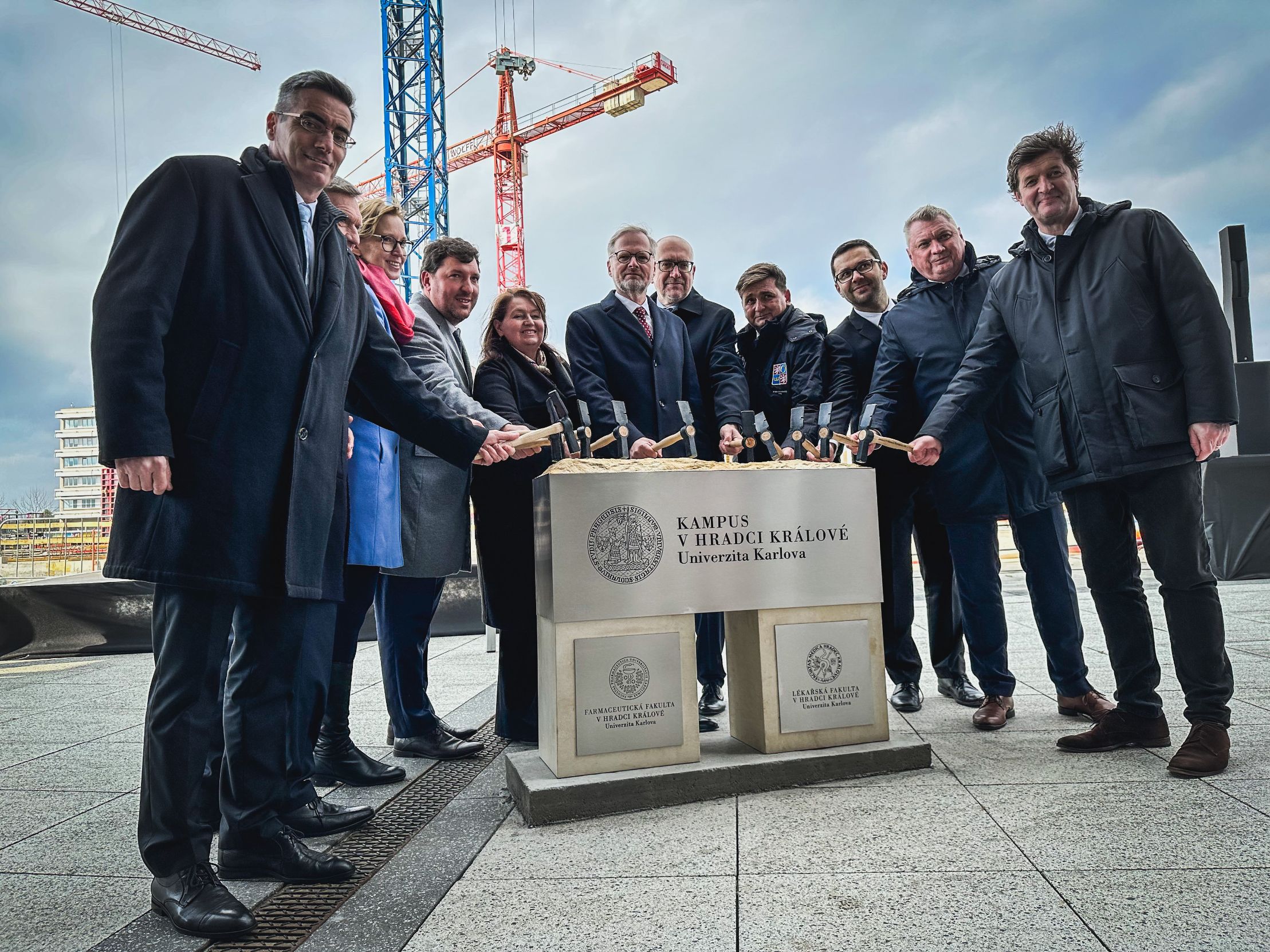 Představitelé Univerzity Karlovy přivítali významné hosty v čele s předsedou vlády ČR prof. Petrem Fialou a ministrem školství doc. Mikulášem Bekem před první budovou Kampusu UK v Hradci Králové, která byla dokončena v roce 2015. Právě v prostoru vedle Fakultní nemocnice již rostou obrysy budov druhé etapy stavby kampusu, kterou realizuje v konsorciu stavebních dodavatelů společnost SYNER. V rámci dostavby kampusu dojde k vybudování přes 40tis. m2 čistých užitkových ploch pro výuku a výzkum a celkem přes 70tis. m2 užitkové plochy v jedné lokalitě.
