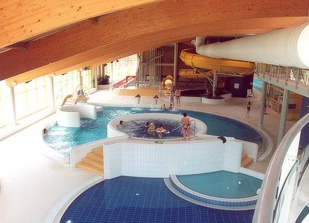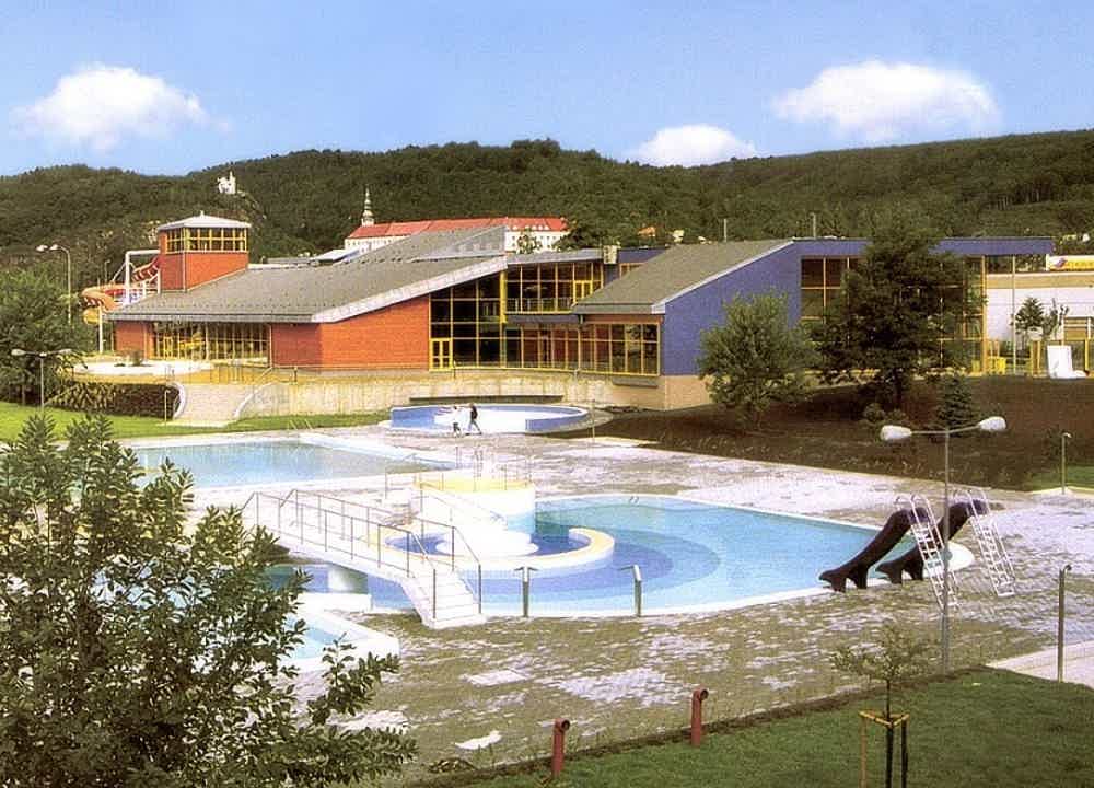 The location of the construction in the area of a former landfill and in close vicinity of the river Ploucnice (and thus in a floodplain) greatly influenced the structural design of the whole project, particularly its foundations. The structure is based on large-diameter bored piles and its basement is formed by a compact reinforced concrete tank with the upper edge in “Q100“ (i.e. above the 100-year flood level). The above-ground part of the building is then a combination of vertical masonry structures, horizontal reinforced concrete structures and supplementary steel structures with a partially flat and a partially shed roof. Besides a 25 m long swimming pool, the building also houses two outdoor and one wide indoor toboggan slides, two whirlpool baths, relaxing swimming pool with a canal to an outdoor artificial river and a children’s wading pool. There is also a wellness, a gym, massages, solariums and other supplementary services. Naturally, there are both common and separate dressing rooms, showers and toilets for visitors. The operation of the whole premises is based on thermal water which is used in the swimming pools (after a treatment which makes it drinkable), for heating of the building with heat pumps, in the showers and as service water before it is discharged into the sewers.