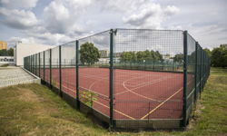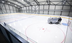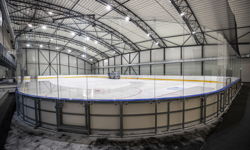 It is a three-story indoor building with two ice rinks, connected by a central part, which houses the facilities for sports facilities and other operations.